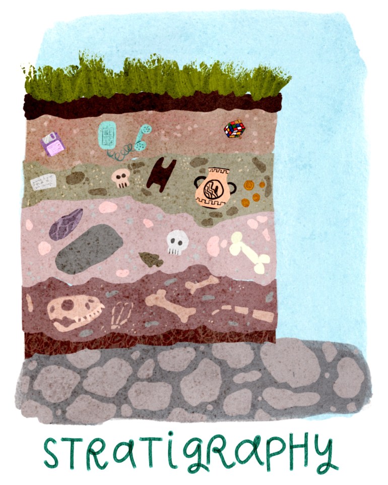 Stratigraphy is the study of layers of archaeological remains deposited over time. Usually, the lower the layer, the older it is. Archaeologists can often determine the relative age of artifacts by comparing the positions of the layers where they are found. A single layer is called a stratum; more than one are called strata.